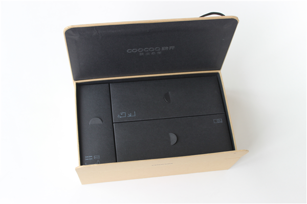 盒多數牛皮紙包裝一樣,這款包裝并沒有印刷太多的圖案,只是在皮殼上印有創維酷開的logo圖案,單色印刷簡潔素雅,十分大方。